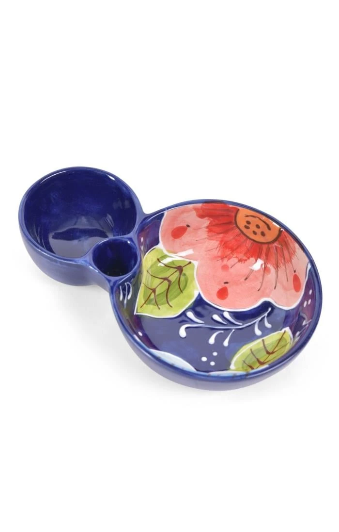 Serve up a splash of Spanish colour at your next social gathering with this hand painted ceramic olive dish. Featuring separate sections for olives, pits and cocktail sticks in vibrant hues inspired by Mediterranean colours and landscapes, this vividly imagined dish will add visual impact to your snack selection.