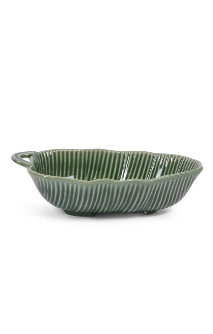 Depicting a verdant banana leaf curled into a shallow sided dish, this hand painted earthenware bowl is the perfect space for salads, starters or snacks. Made in Portugal using time-honoured techniques honed through generations, its tactile textured surface and glossy glazed finish will bring lunches and supper parties to rich and vibrant life. Ideal for gifting.