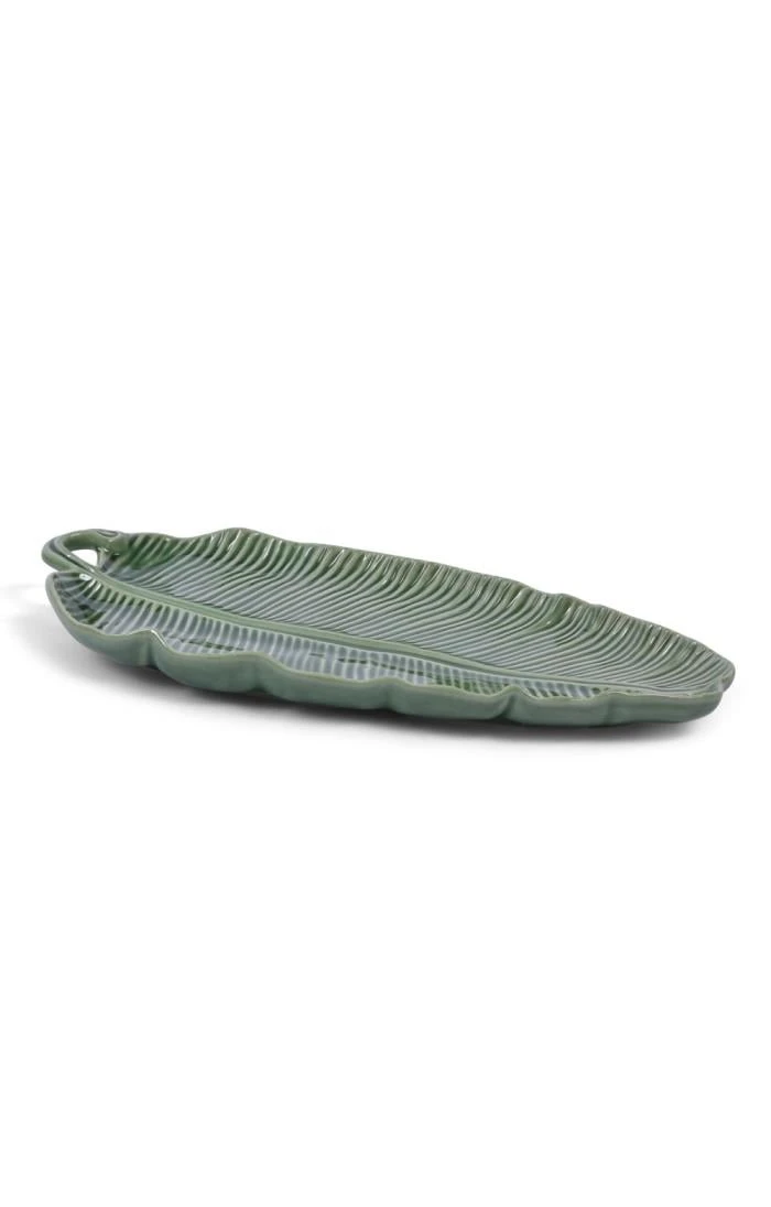 Attract admiring glances when you serve your guests from this large earthenware banana leaf platter. An impressive centrepiece for your summer table, contrast its vibrant green hand painted finish with vivid pink watermelon wedges or creamy mozzarella slices with ruby red cherry tomatoes for a dish that tastes as fresh as it looks. Ideal for gifting.