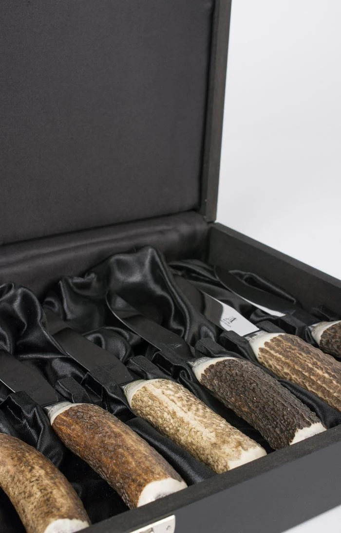 Presented in a handsome storage box, this set of six steak knives are handcrafted from ethically sourced Scottish deer antler using centuries-old traditional skills. Each handle is uniquely patterned and coloured in the distinctive organic style that only natural antler can create, producing a set that’s full of character and charm.