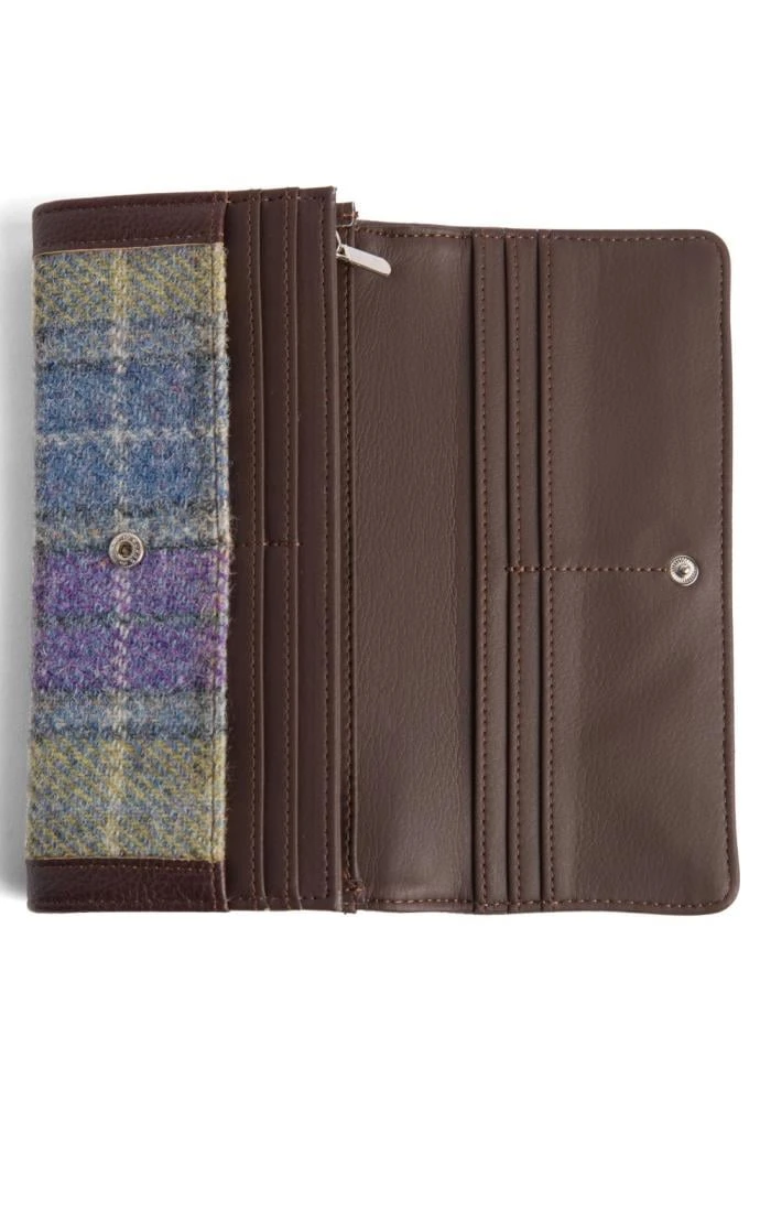 Our Harris Tweed Flapover Purse is a great way of keeping your important details all together while still looking good. With its long wallet style this purse has four sections that allow you to keep your cards together and safe along with a main zip compartment to keep your change tucked away. Made from Harris Tweed handwoven on the Outer Hebrides islands of Scotland, this flapover purse comes with an authentic tag and certification trade mark.