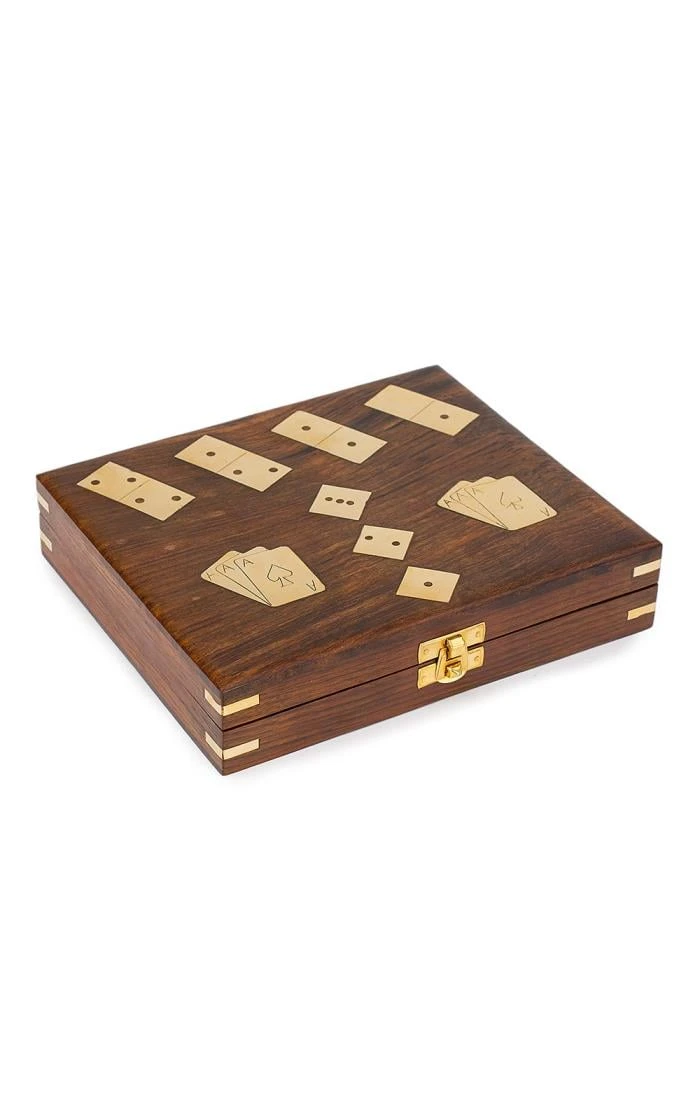 Be sure to impress when it’s time to bring the after-dinner games to the table with this elegantly striking hardwood box of games with brass detailing. Contains a full set of dominoes, two packs of cards and five wooden die.