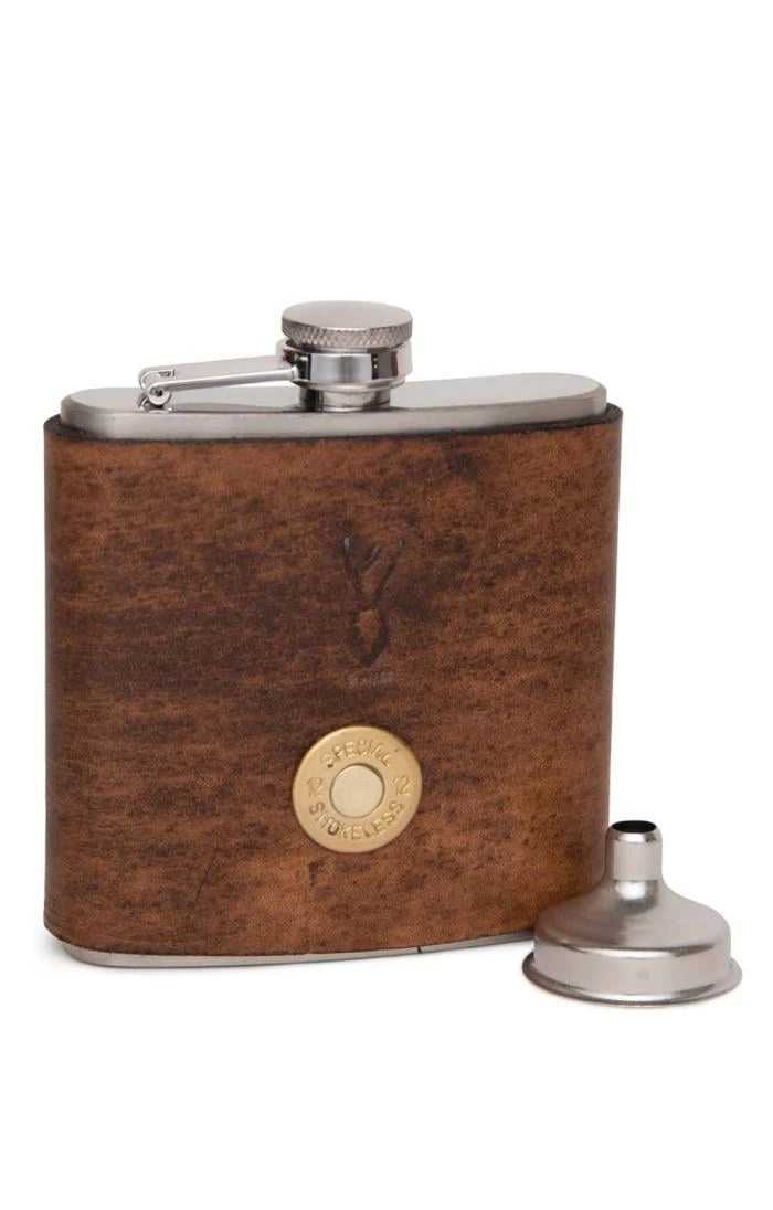Keep a warming dram close to hand on chilly days in the hills or by the pitch side with this beautifully crafted hip flask. The handmade leather outer is finished with a genuine 12-bore shotgun cartridge while the stainless steel flask comes complete with a funnel for easy topping up. An exciting and imaginative gift for country gents and lovers of sporting pursuits.