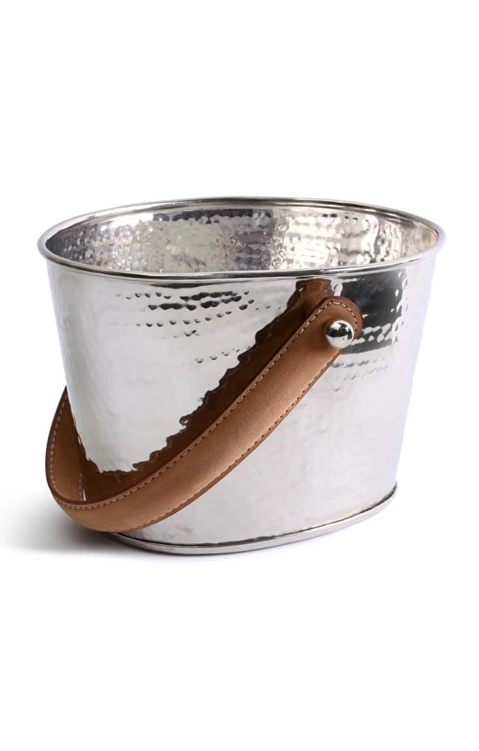 Elevate your cocktail nights and impress your guests with this stylish metal ice bucket with an attractive hammered nickel plate finish. Filled with crystal clear cubes of ice ready to cool your favourite drinks, this beautiful bucket is finished with an elegant leather handle that is both eye-catching and practical.