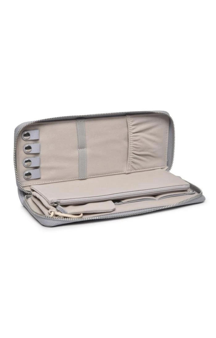 This stylish jewellery roll is a fun way to store you favourite necklaces and bracelets when you’re on the move. With a faux leather exterior and a soft velvet lining, this zipped case has space for up to four necklaces or bracelets, a tab for keeping your rings secure and an earrings holder.