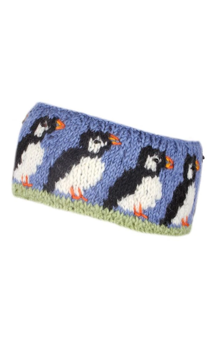 Stop your hair from flying about and keep your ears toasty warm in the Circus of Puffins headband in 100% wool. A flock of the brightly-beaked seabirds circles this charming handmade headband which has a plush fleece lining for further cosiness. A Fair Trade Product.