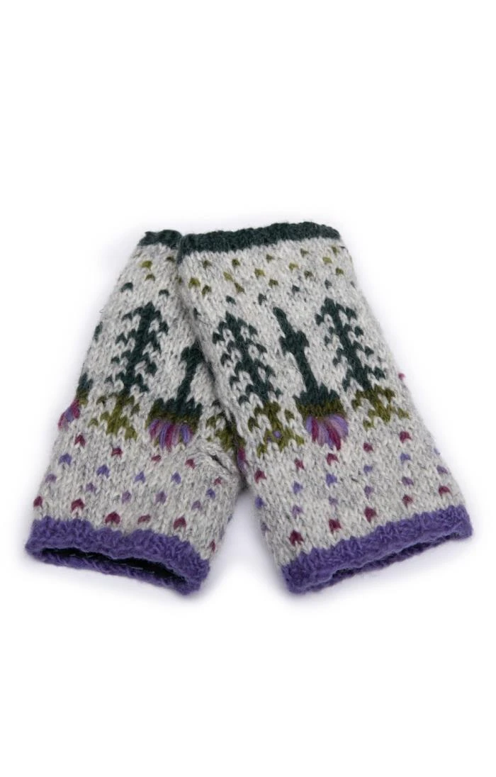 A stylish handmade alternative to gloves, this ladies Thistle handwarmer is a fingerless option crafted from premium wool in the mountains of Nepal. Each handwarmer has been embroidered with pretty thistles and given a pop of distinctive purple colour which is mirrored along the seam, and every hand knitted stitch is outlined in a distinctive chevron pattern.