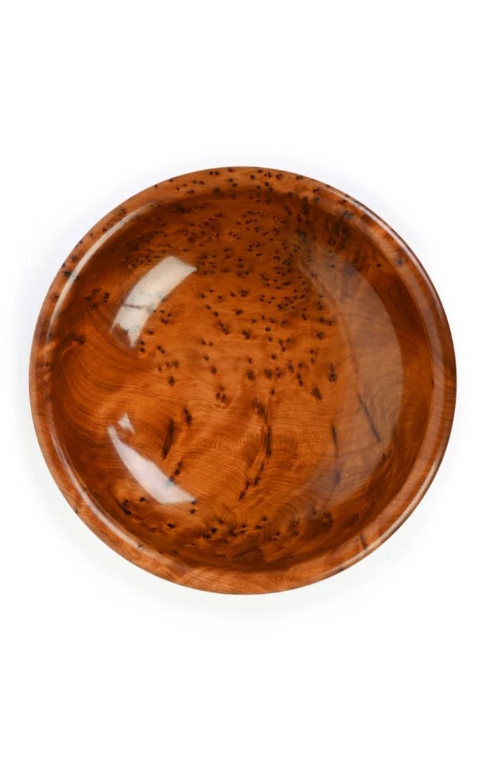 This large wooden bowl is carved from a single root of the Thuya tree and polished to a high shine by gifted craftsmen. Ideal for a multitude of uses, whether you’re filling it with exotic fresh fruit or using it as a purely decorative item, this attractive handmade dish will take pride of place on your living room coffee table.