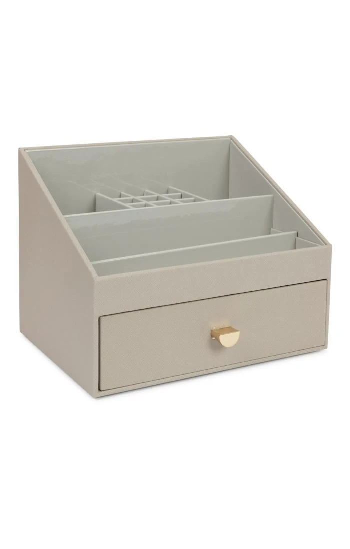 This attractive faux leather make up organiser looks wonderful on your bathroom counter and keeps your favourite lipsticks and powders neat and tidy. The open top is suitable for taller items, while pull out drawers are large enough for palettes in a variety of shades and hues. Wipe-able and easy to clean, this is a must-have accessory for that big night out.
