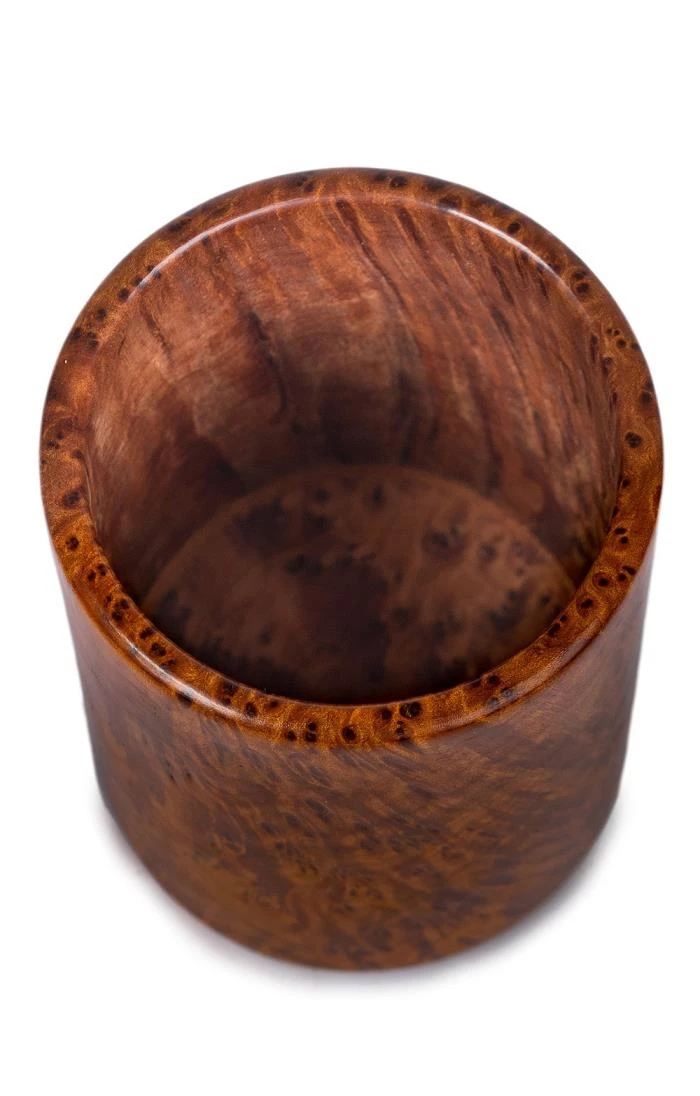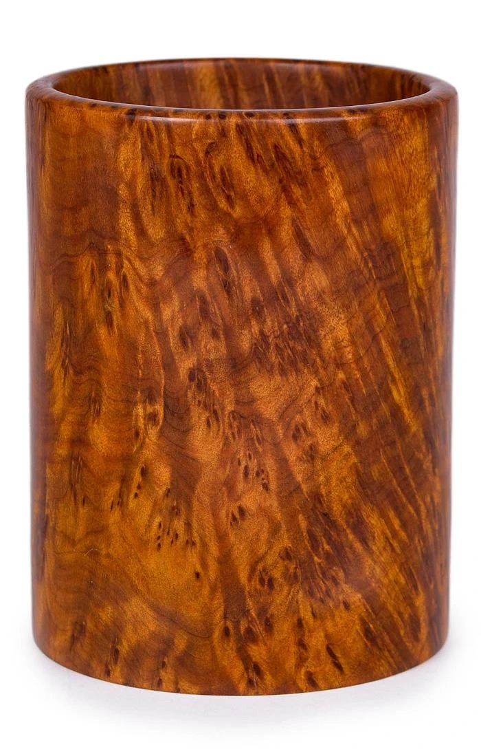 This polished wood round penholder is made from expertly worked Thuyawood, an unusual wood with a strikingly patterned grain which attains a deep reddish-brown lustre after hours of skilled polishing. A beautiful and practical addition to any writing desk.
