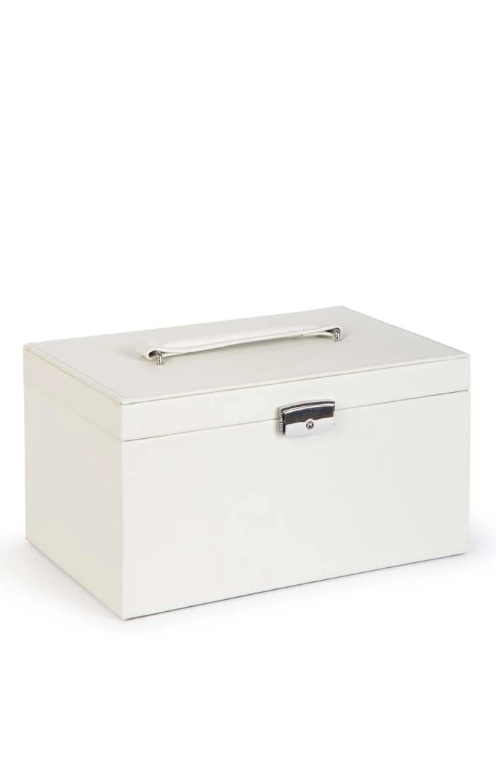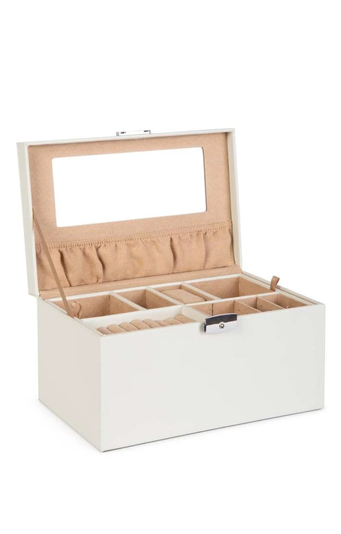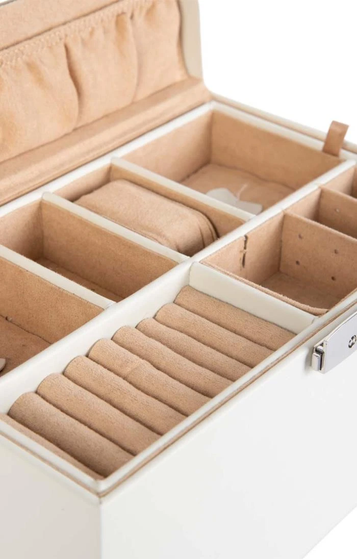 Crafted from the finest bonded leather, the Princess jewellery case is a delightfully decadent and practical storage solution for your cherished jewels. Lined with luxuriously soft velveteen, the case features an inner lift out tray with two watch holders, ring rolls, earring holders and separate compartments. A convenient mirror sits to the interior of the lid along with an elasticated pocket and a large storage section can be found below the tray. This box is also lockable to keep items safe and secure.Â