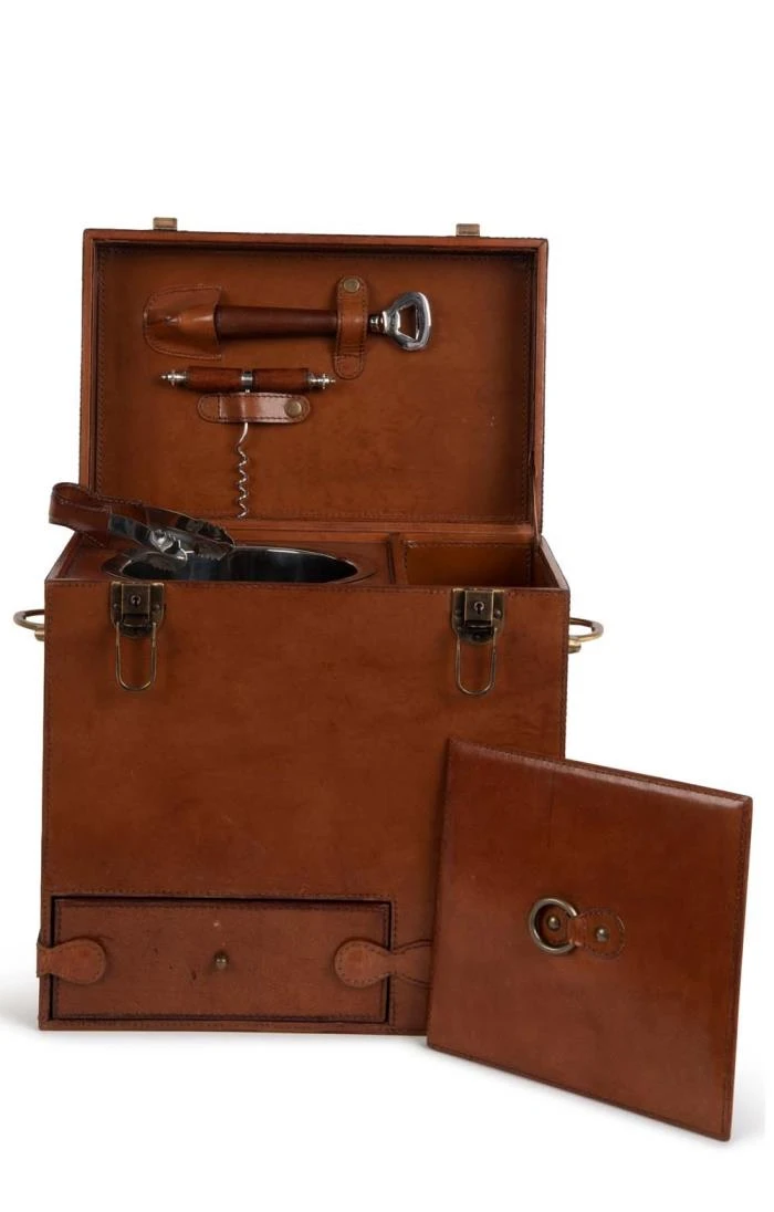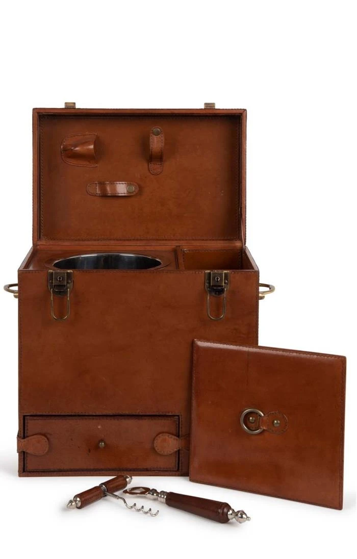 Strikingly sleek and sophisticated, the shoot drinks box is expertly crafted from luxurious leather and exudes optimum quality. Designed to carry two bottles, there is an integral ice bucket complete with leather handled ice tongs, corkscrew and bottle opener as well as a bottom drawer that holds 9 stainless steel beaker-style cups. An incredibly thoughtful and generous gift for a special couple or any enthusiast of outdoor sporting.Â