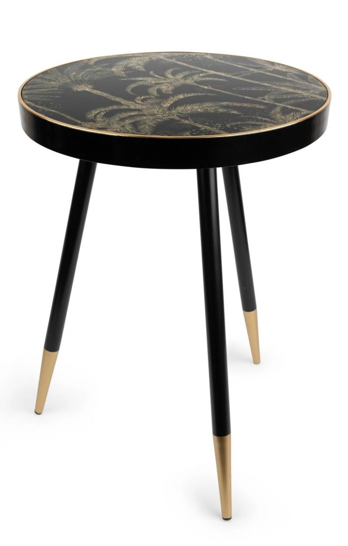 Add an exotic accent to your entertaining with this palm tree patterned side table with its black and antiqued gold acrylic overlaid surface. The 45cm diameter round top is beautifully balanced on three elegant gold-tipped legs to create a charming addition to your occasional collection and set the perfect stage for cocktails, coffees, canapés and more.