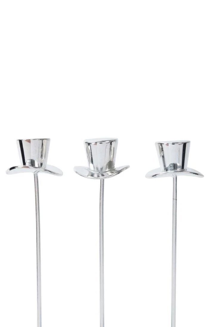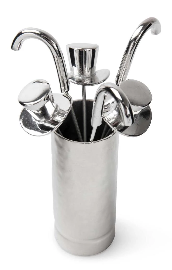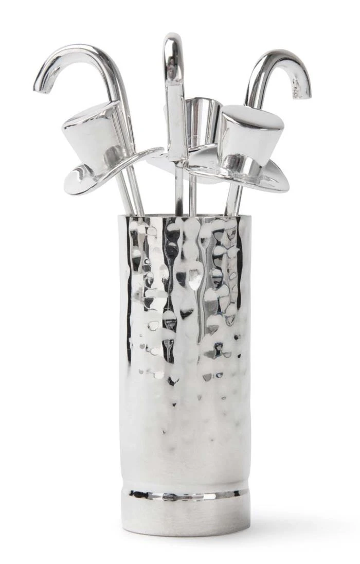These handy dandy olive picks will add a sophisticated air to any dinner table, complete with their own polished holder. The highly polished holder is finished with an eye-catching hammered texture, and the picks themselves are styled after dapper top hats and walking sticks for a touch of fun.
