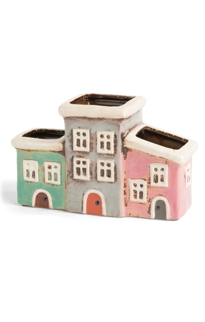 This vibrant and charming ceramic three house planter makes a delightful addition to your home. This unique piece, measuring approximately 21 cm in width, 13 cm in depth, and 8 cm in height, depicts three quaint houses, offering an ideal opportunity to infuse colour onto window ledges, terraces, or decking. The planters are a textured masterpiece reminiscent of the rustic allure and nostalgic grace of coastal cottages in Scotland. Crafted with precision by skilled artisans, it stands as a truly distinctive and exceptional gift choice, perfect for adding character and charm to any living space.